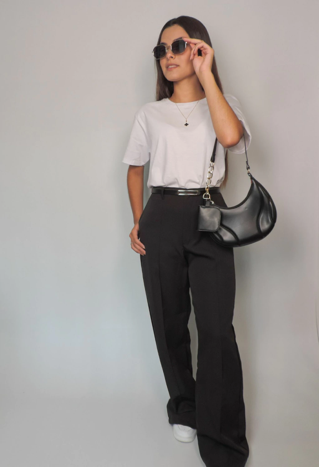 A Calça Alfaiataria Preta com modelagem wide leg é a peça chave para quem busca um visual sofisticado, moderno e confortável. Seu corte amplo e fluido oferece liberdade de movimento, enquanto os detalhes bem pensados valorizam o corpo e adicionam um toque de elegância.