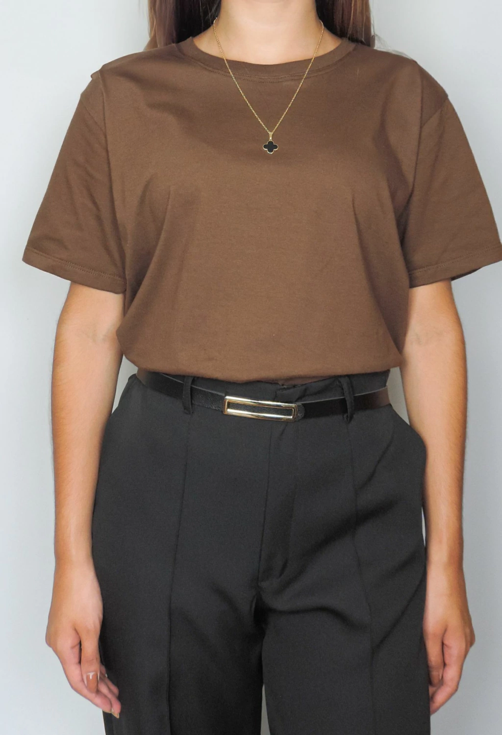 A camiseta clássica marrom é a peça curinga que não pode faltar no seu guarda-roupa. Confeccionada com tecido de alta qualidade, ela oferece conforto, durabilidade e um caimento perfeito. Feita em 100% algodão, é ideal para todas as ocasiões, seja para um visual casual ou para compor looks mais elegantes com sobreposições.