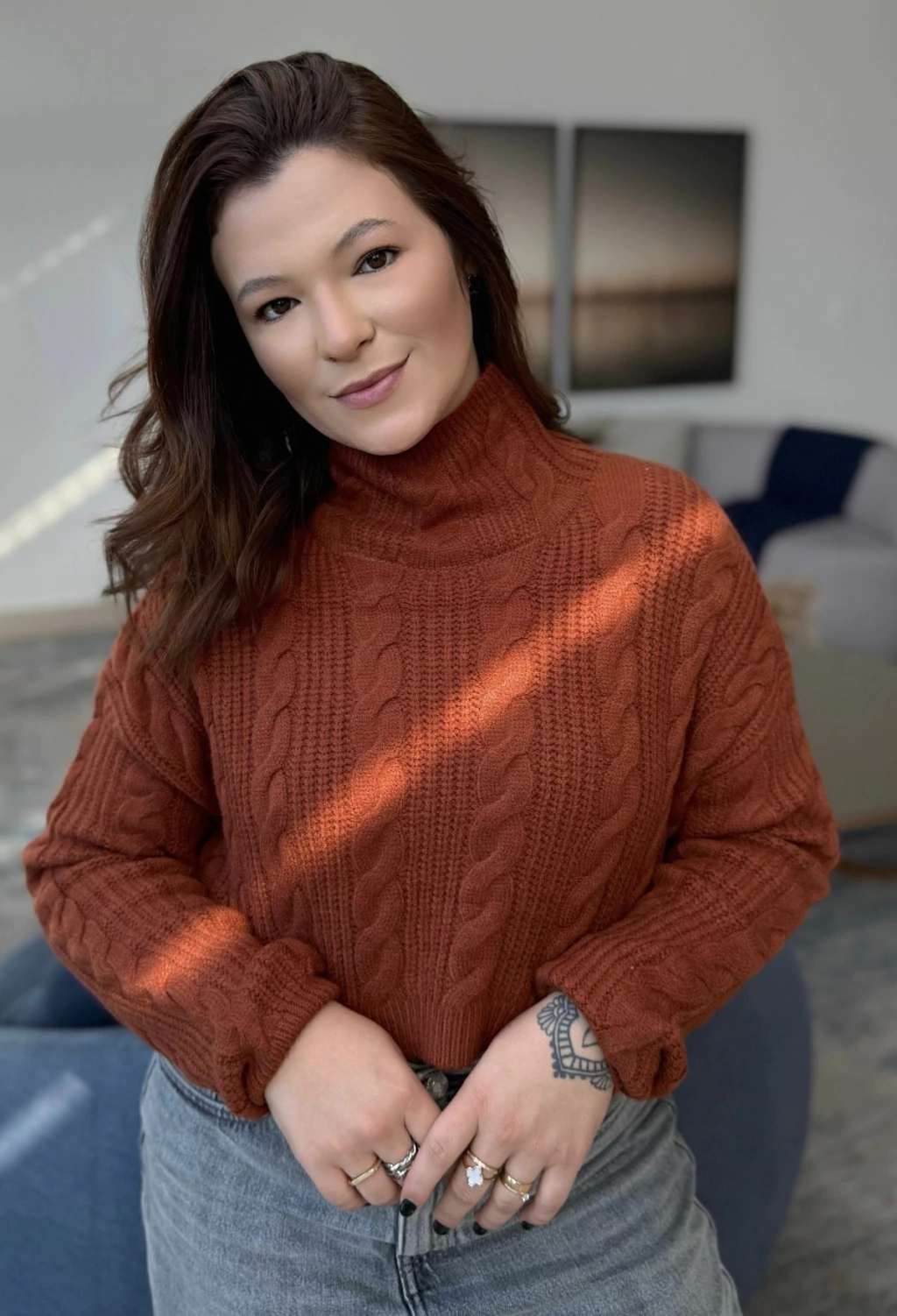 Suéter Cropped de Tricô Trançado Marrom – O Toque Sofisticado para o Seu Inverno