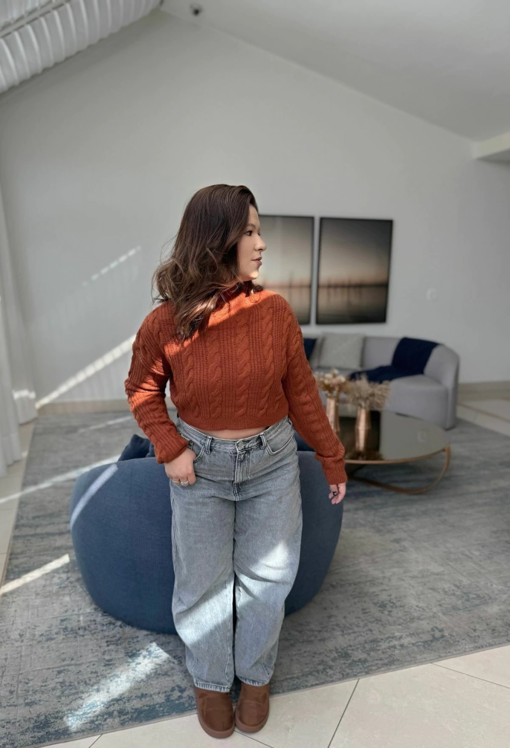 Garanta já o seu suéter cropped de tricô trançado marrom e eleve seu estilo no inverno com uma peça elegante e aconchegante!